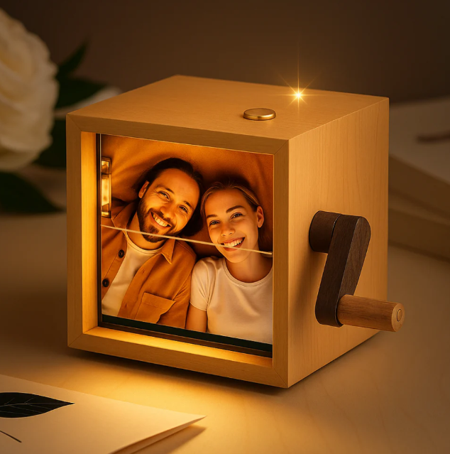 Yes! Thanks to the built-in warm LED light, MemoriaRotante™ gently illuminates your photos, making them visible at night while creating a romantic and peaceful atmosphere